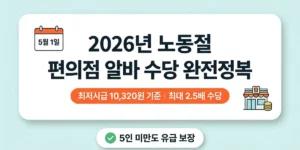2026년 5월 1일 노동절은 단순한 유급휴일을 넘어, 법 개정을 통해 ‘법정공휴일’의 지위까지 갖게 된 역사적인 날입니다. 편의점 알바생이라면 5인 미만 사업장이라도 무조건 유급휴일을 보장받으며, 특히 5인 이상 사업장(직영점 등)은 야간 …